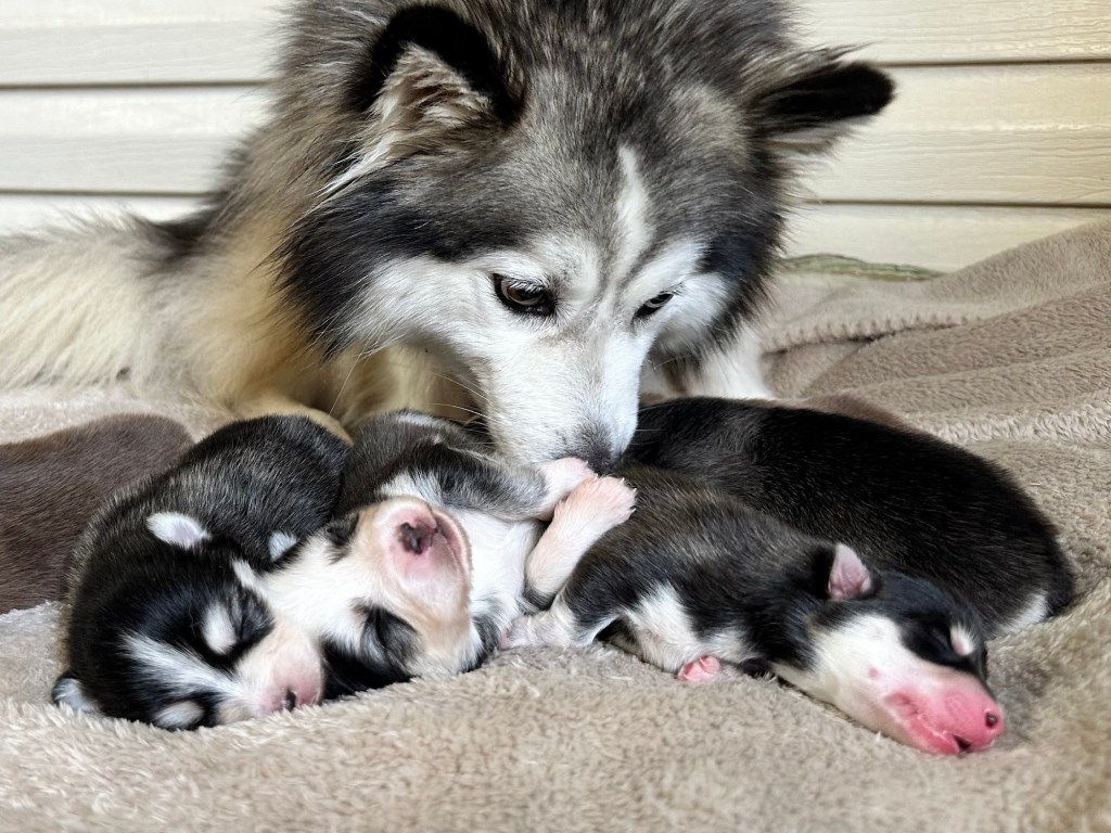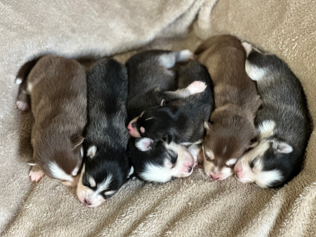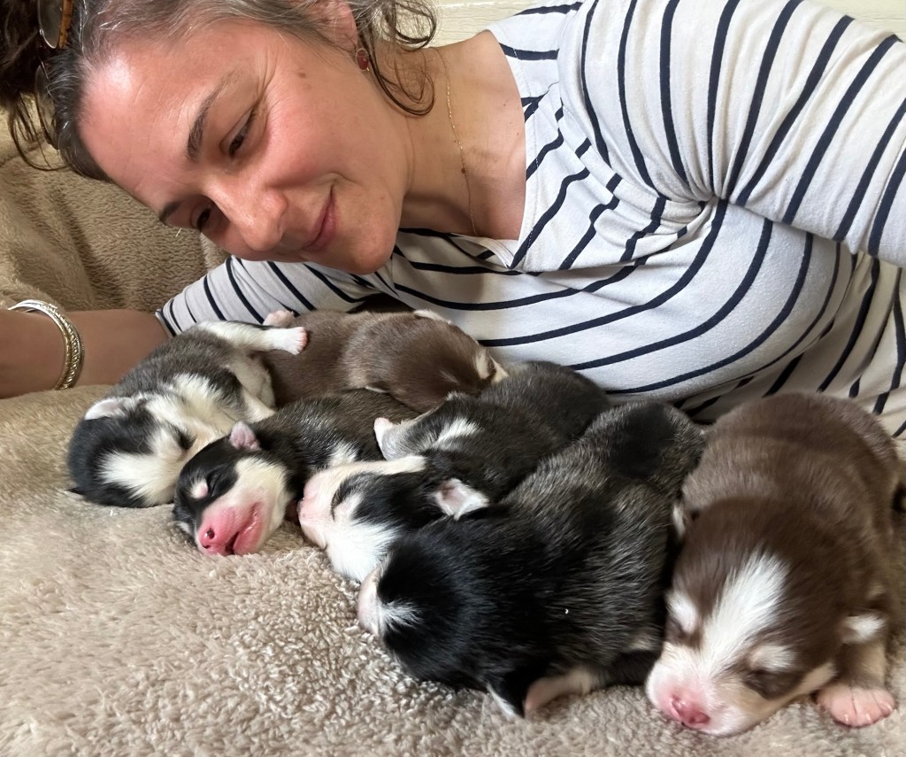 Nous avons été accueillis par Kemy jeune maman de 5 chiots qui entendait les petits couinements inimitables.